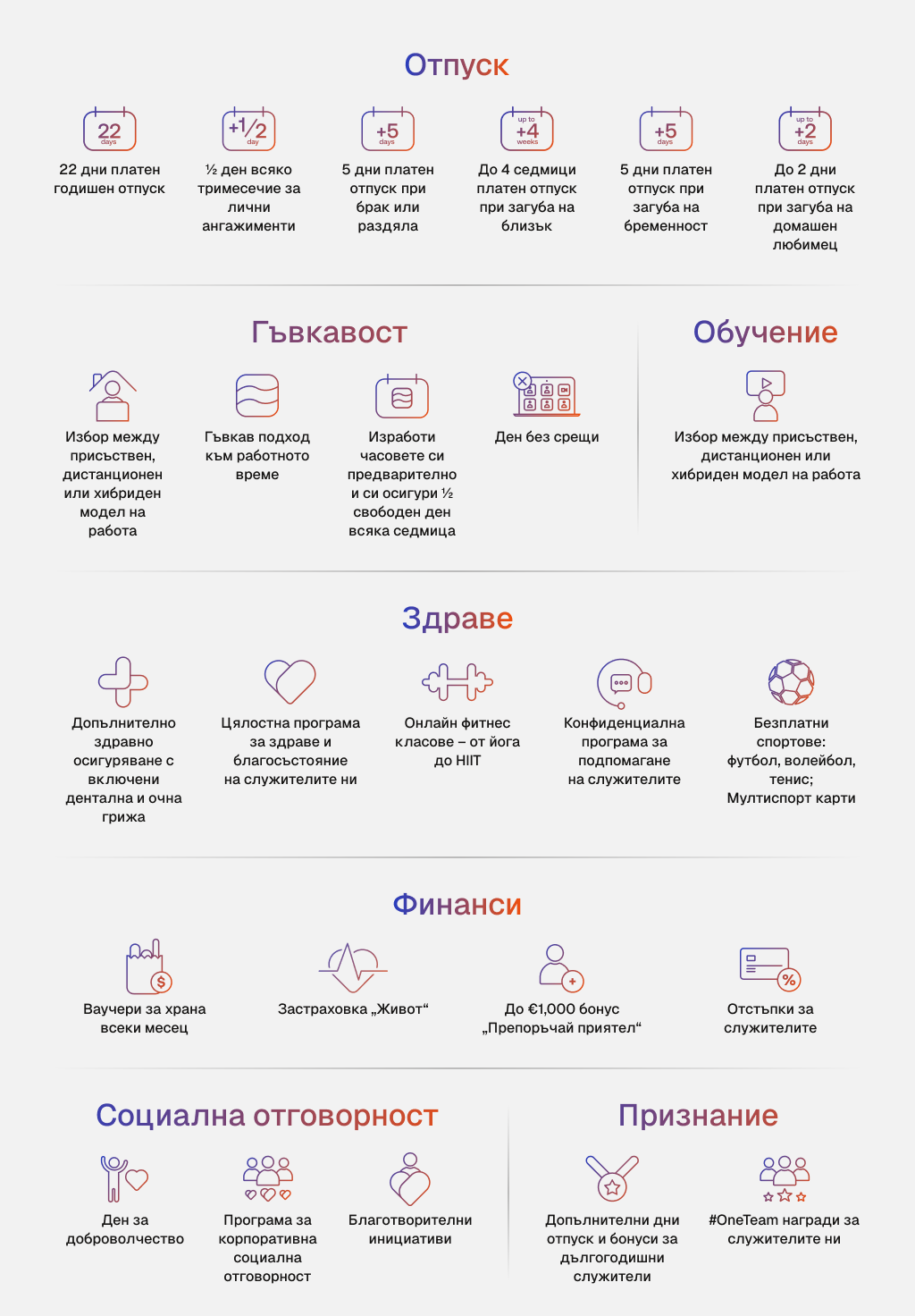 22 дни платен годишен отпуск за всички служители.